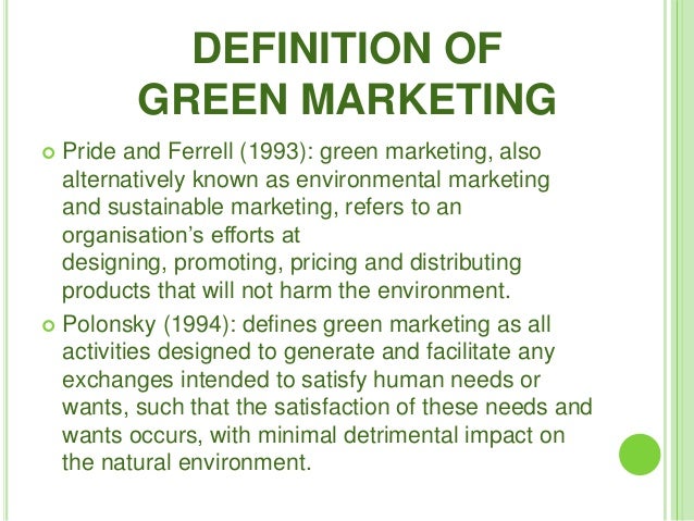 Green marketing is one component of a broader movement toward socially and environmentally conscious business practices. The aim is to design the production. Green marketing definitions can be a little confusing, since green marketing can refer to anything from greening the obvious assumption of green marketing is that potential consumers will view a product or service's greenness as a price is a critical and important factor of green marketing mix. • introduction • evolution • definition • benefits • green marketing adaption • green marketing mix • challenges • green ?