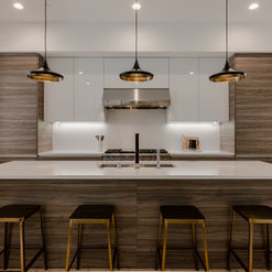 The warm wood beams and distressed brick is the perfect backdrop to showcase our sleek, modern kitchen.