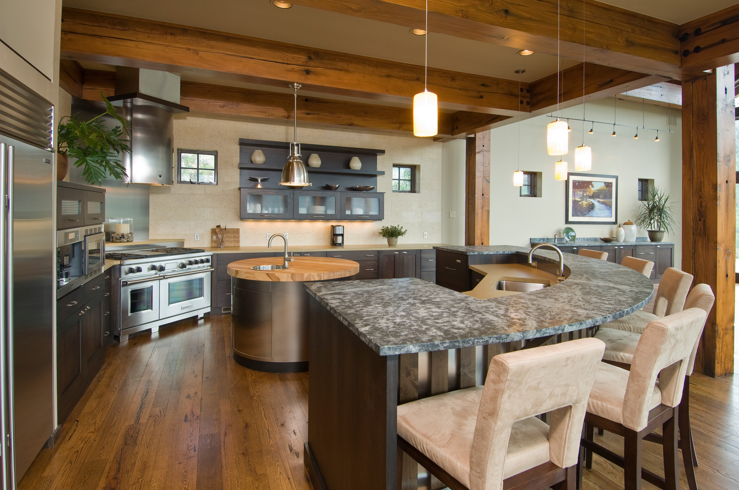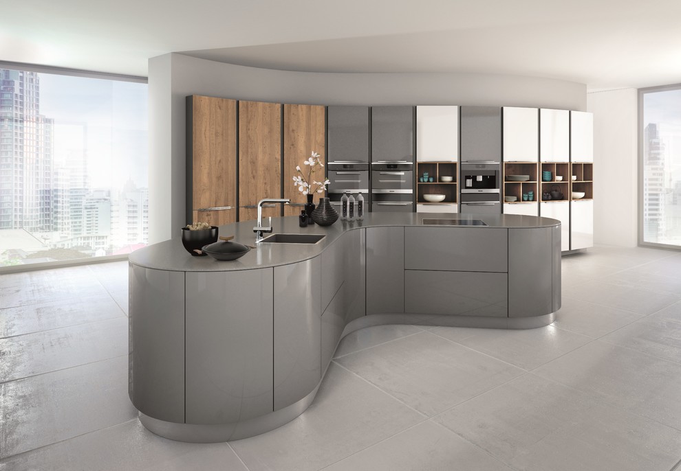 The ergonomic kitchen island takes centre stage. If you're a lover of things that are a little bit different then you probably want your kitchen to reflect your sense of individuality and style. Shown here topped with a stunning 'round deck' stainless steel worktop, the curved island extends.