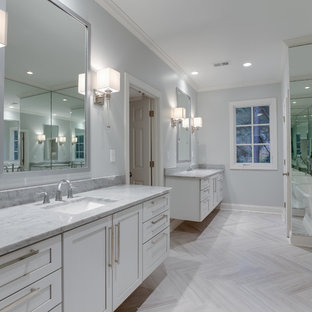Clean lines and refined elements — marble, light wood —have a starring role in the master bath of this craftsman.
