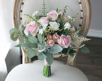 This super popular mix of soft colored pink roses and lovely green accents like eucalyptus and waxflower is trending this year!