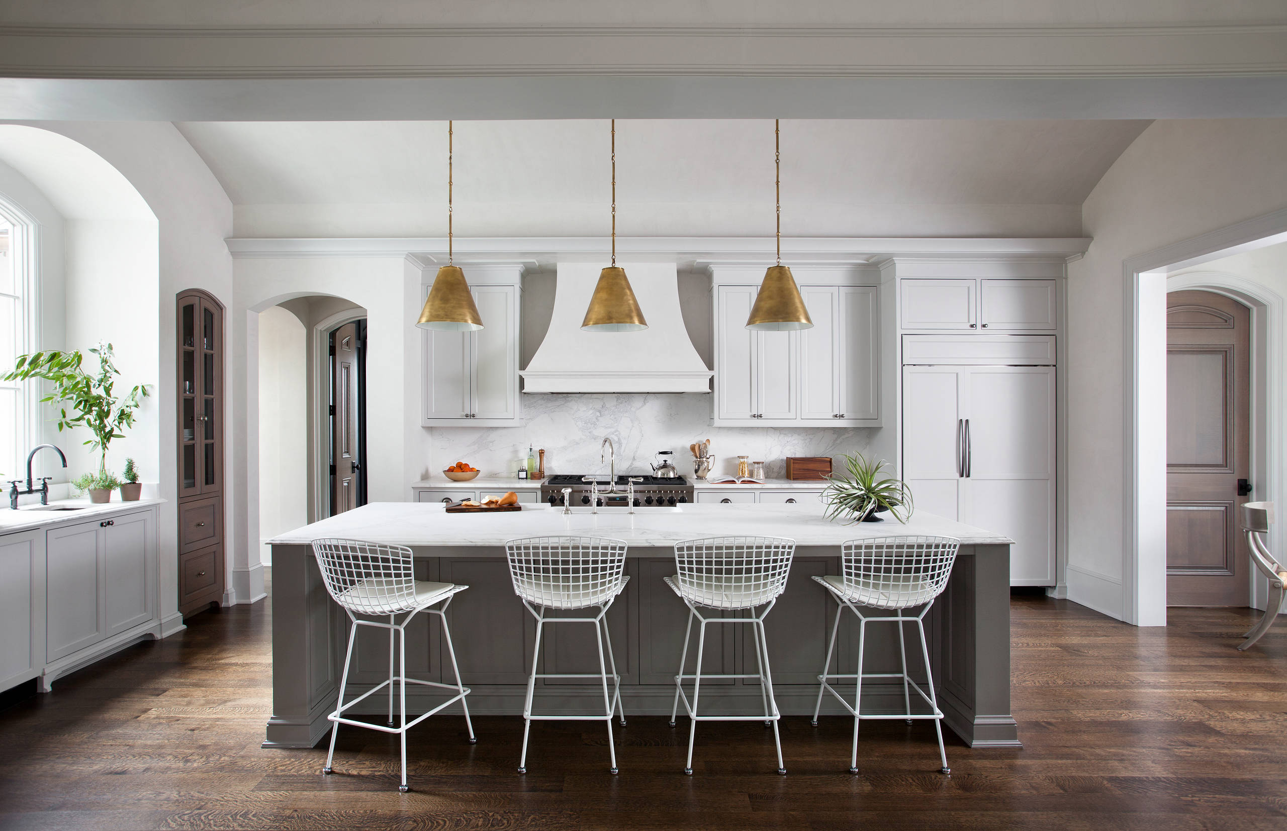 Gorgeous White Modern Casual Kitchen With Gold Pendant Lights And Wide Plank Wood Floors Desig Modern Kitchen Interiors Wood Floor Design Kitchen Bar Design from i.pinimg.com