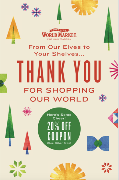 22+ Cost Plus 20 Percent Coupon. Clearance items are not eligible for price adjustments. Use cost plus world market coupon codes to save on the already low prices and receive discounted or free shipping.