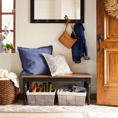White wood bench with wicker baskets and wood headboard with metallic hangers.