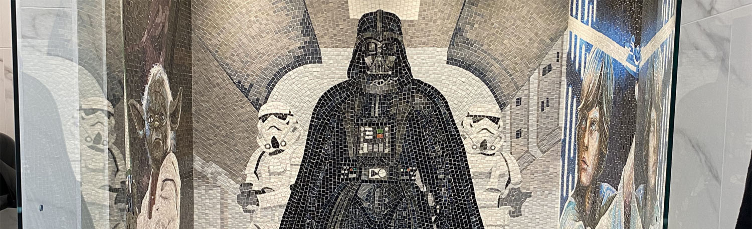 In A Bathroom Far Far Away This Unique Star Wars Bathroom Tile Mosaic Adorns The Wall Designed By Jagoda Archite Star Wars Bathroom Tile Bathroom Shower Wall from i.pinimg.com