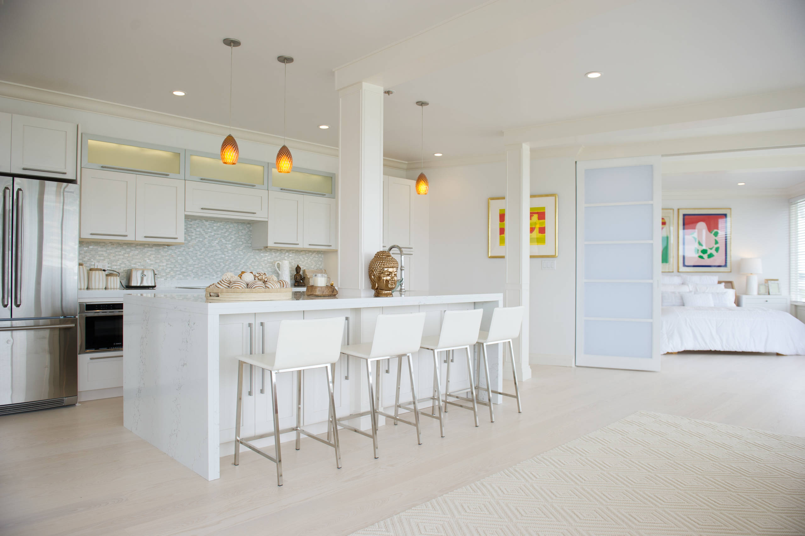 Tacos al pastor with pineapple del monte! People gather to snack, chat and even entertain. The counter acts as a workstation, which can be used for a variety of purposes including cooking and dining. It is a fully functional kitchen island and a table.